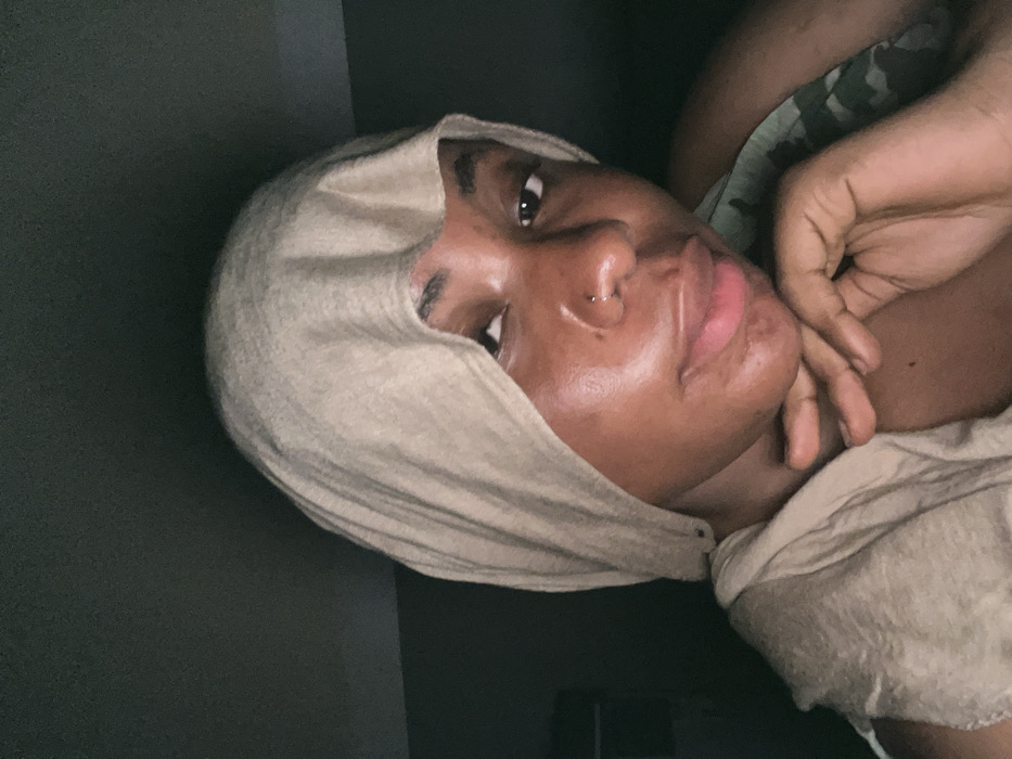 The image depicts a young adult female with dark skin, situated in a low-light indoor environment within the city of Zango-ndaji, Nigeria. She wears a light beige or khaki-colored fabric draped over her head and shoulders, with a portion of a green camouflage-patterned garment visible on her right side. A small silver-toned stud is present in her left nostril. Her left hand is positioned under her chin, with fingers slightly curled. The subject is looking directly towards the camera, with her face illuminated by a primary light source that highlights her forehead, cheekbones, nose, and lips. The background is uniformly dark and devoid of discernible features.