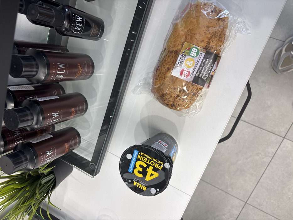 The image displays a white tabletop in a retail or convenience store setting, consistent with locations found in Plovdiv, Bulgaria