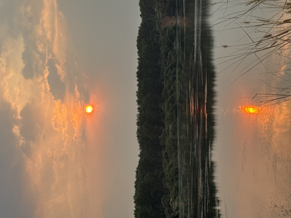 The image depicts a sunset over a body of water in Dĩ An, Vietnam. The sun, a bright orange-yellow sphere, is visible in the upper-center, partially obscured by light grey clouds against an orange-hued sky. A prominent, shimmering orange-yellow reflection of the sun extends vertically on the calm water surface below. A dense line of dark green trees forms the horizon, separating the sky from the water. On the far left bank, partially hidden by vegetation, a small, light-colored tent or structure is visible. On the right bank, beyond the tree line, an exposed section of reddish-brown earth is present. Sparse reedy vegetation with feathery tops rises from the water along the lower right edge of the frame. The water surface shows patches of dark aquatic flora or debris. No human figures or discernible activities are present.