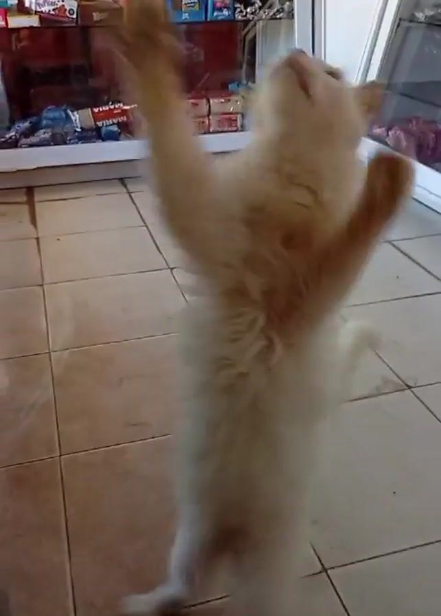 A short video shows a white cat in what appears to be a store. The cat is standing on its hind legs, reaching upward, seemingly attempting to grab something out of frame above it. The cat is in front of a glass display case with various items, possibly food and candy, visible inside. The floor is tiled with light-colored square tiles.