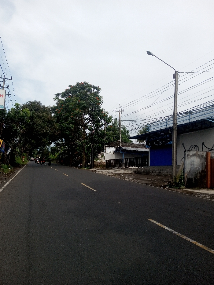 The image depicts an overcast street scene in the city of Sat Thay (East), Myanmar. An asphalt road occupies the lower portion of the frame, featuring a broken yellow centerline and a solid white line on its left edge. Several motorcycles, some with riders, are visible in the far distance on the left side of the road, traveling away from the camera. The left side of the road is bordered by dense green foliage, including large trees, one of which displays red-orange blossoms. Utility poles with numerous overhead wires are integrated into the tree line, and a partially obscured sign with the letter "H" is visible behind the foliage. On the right side of the road, a prominent grey utility pole supports a street light directed leftward over the roadway and carries a complex network of overhead wires. Adjacent to the pole is a commercial building with a blue facade, a corrugated metal roof, and a sign reading "ADI JAYA MOTOR 88," suggesting a motorcycle shop. To the right of this building, a light grey concrete wall exhibits black graffiti or markings, followed by a segment of an orange-brown wall or structure. Behind the blue shop, a smaller, older-looking building with a light facade and dark roof is partially visible, fronted by a dark fence. The sky overhead is uniformly light grey and overcast.