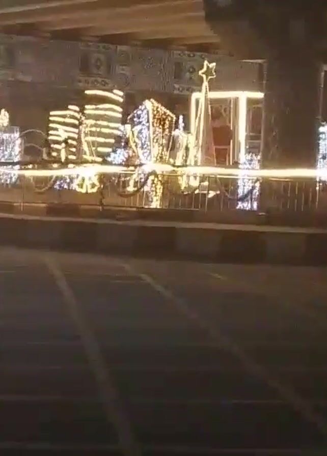 night-time city street scenes, mainly from the perspective of a moving vehicle. The scenes are of decorations that appear to be related to Christmas or New Year's, with bright white and yellow lights. There are building shapes, a star, and what seems to be Santa's sleigh. The video shows a road with some cars and a motorcycle driving by. The camera is shaky and there is motion blur. The environment is urban, with an overpass visible at the top of the frame.