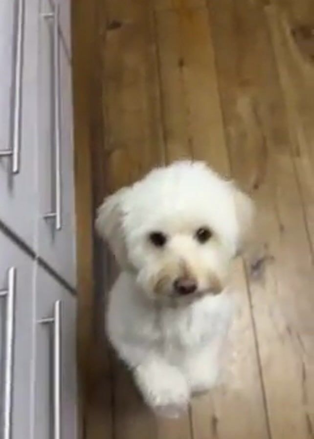 small, white dog standing on a hardwood floor in what appears to be a kitchen