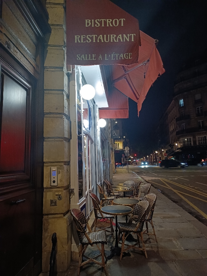- "A street scene at night depicts a "BISTROT RESTAURANT" with "SALLE À L'ÉTAGE" sign" by FM-IaMde2, licensed under CC BY 4.0