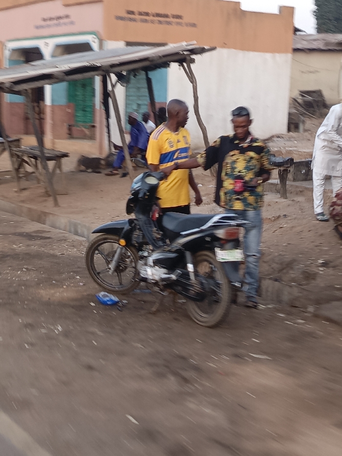 A black motorcycle is parked on a dirt road. Two men are standing next to it, one in a yellow jersey and the other in a patterned shirt and jeans. The man in yellow is handing something to the other. A wooden shelter with benches is in the background, and several other people are visible sitting nearby. The overall scene appears to be in a village or rural area.