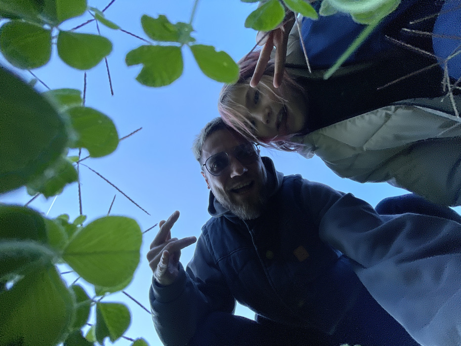An upward-angled selfie captures a man and a girl against a bright blue sky. The man, wearing glasses and a dark jacket, flashes a hand gesture. Above him, a girl with pink-streaked hair gives a peace sign. Green foliage frames the left side of the image, creating a natural border. A puffy white jacket peeks into the frame near the girl. The perspective exaggerates the subjects' size, making them appear to tower over the viewer.