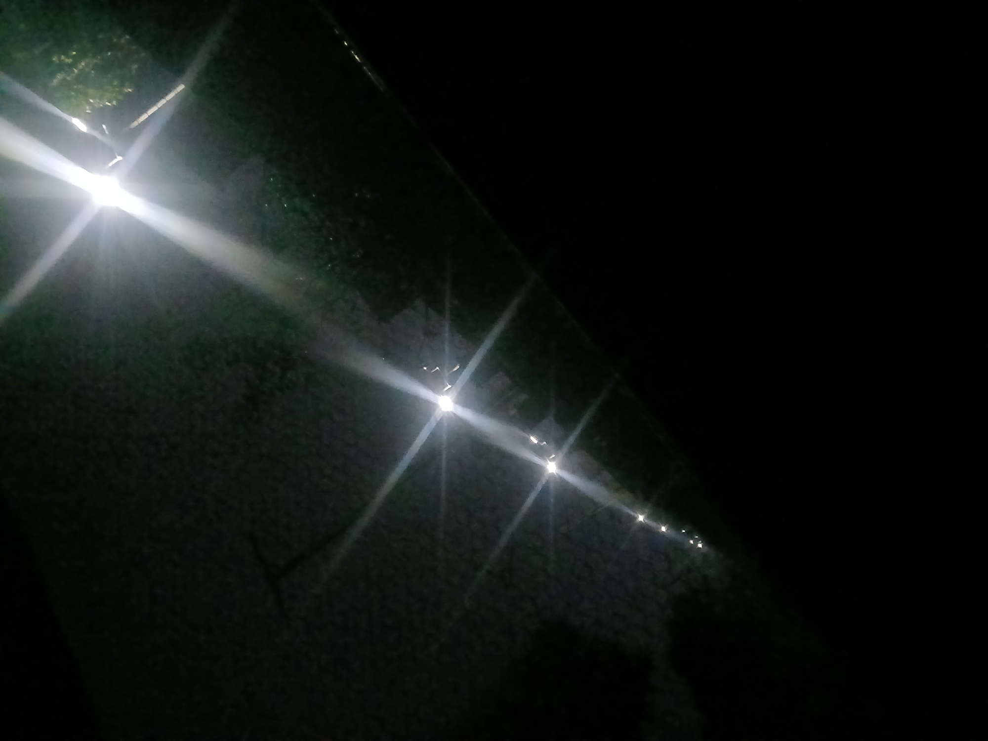 A dark scene with a row of bright lights diminishing in intensity and appearing to be along a fence or wall