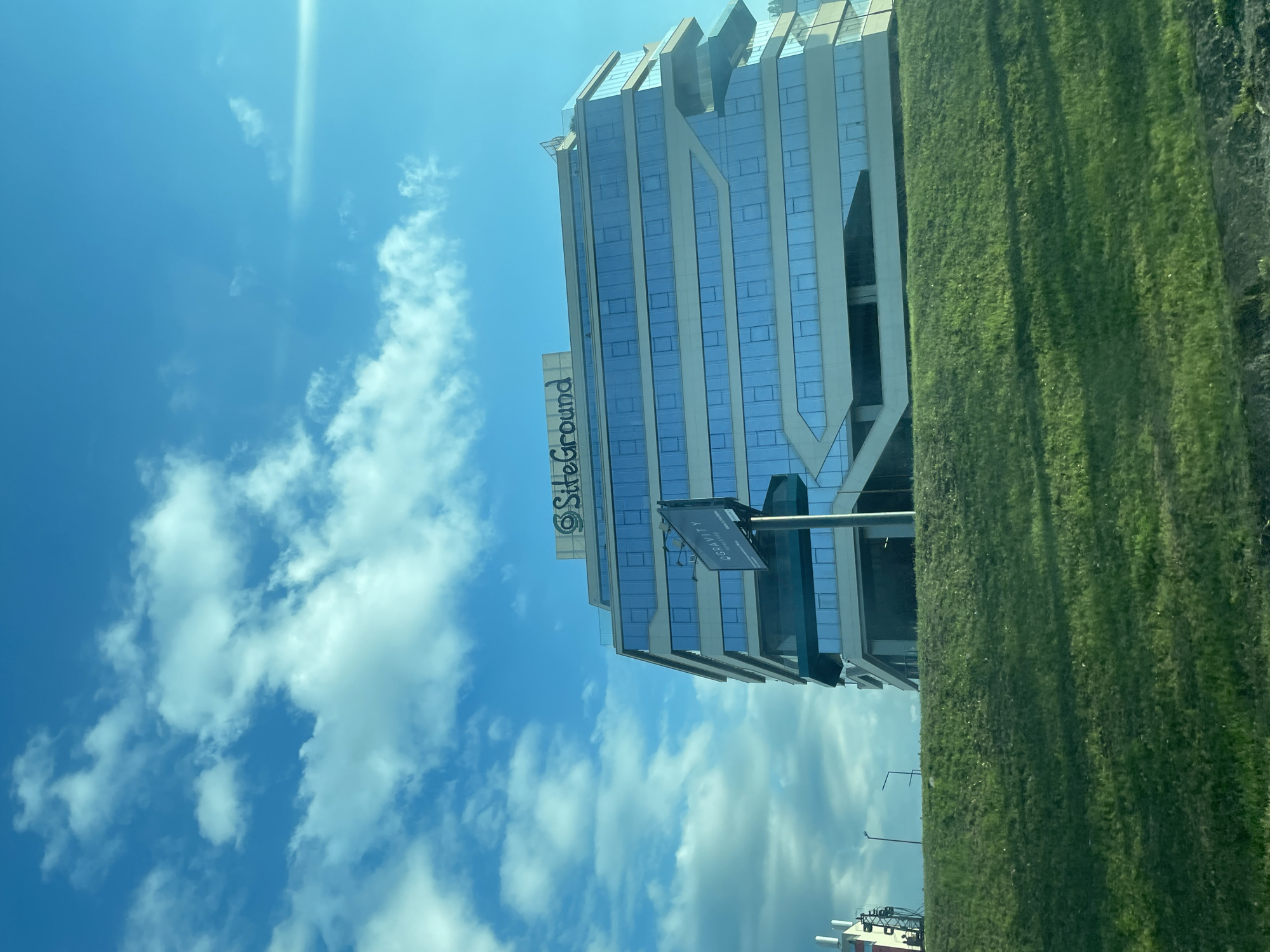 The image depicts a modern building under a blue sky with scattered white clouds. The building is mostly glass with white structural elements and has a sign on top that reads "SiteGround". In front of the building, there is a green wall of vegetation. The photo was taken in Sofia, Bulgaria because the building is the SiteGround headquarters, located at бул. „Цариградско шосе“ 135, 1784 Sofia, Bulgaria. The photo appears to be taken from a passing vehicle. There are no people visible in the image.