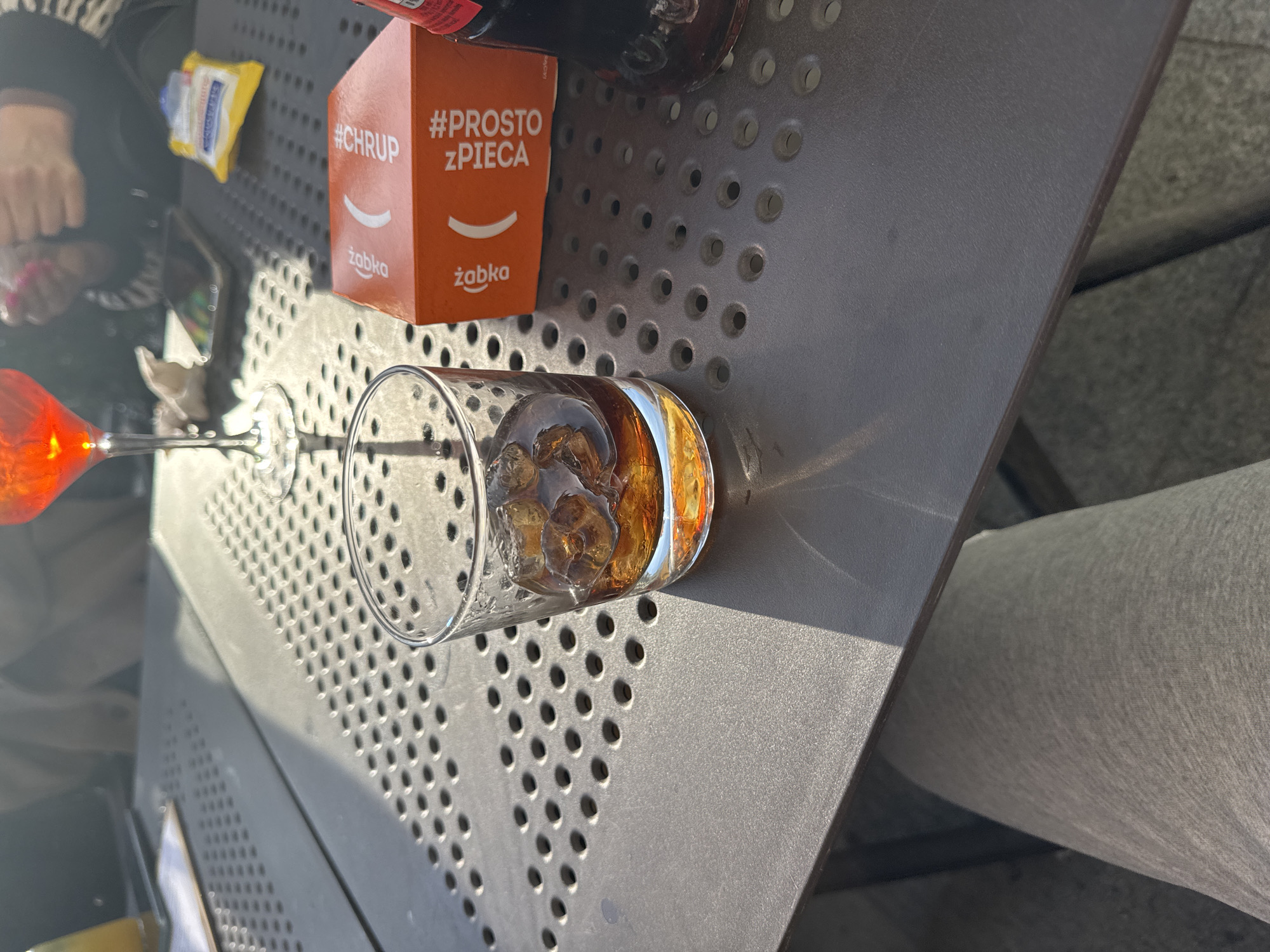 The image depicts a table setting in an outdoor cafe, possibly in Bydgoszcz, Poland, given the presence of a "żabka" box (a popular Polish convenience store). On the table are a glass of amber-colored liquid with ice, a bottle of dark liquid, an orange box with Polish writing, and a yellow snack packet. A hand holding a distinctive orange swizzle stick is visible on the left side of the frame. The table itself is perforated metal, and a person wearing light grey pants is seated at the table. The scene is bathed in sunlight.