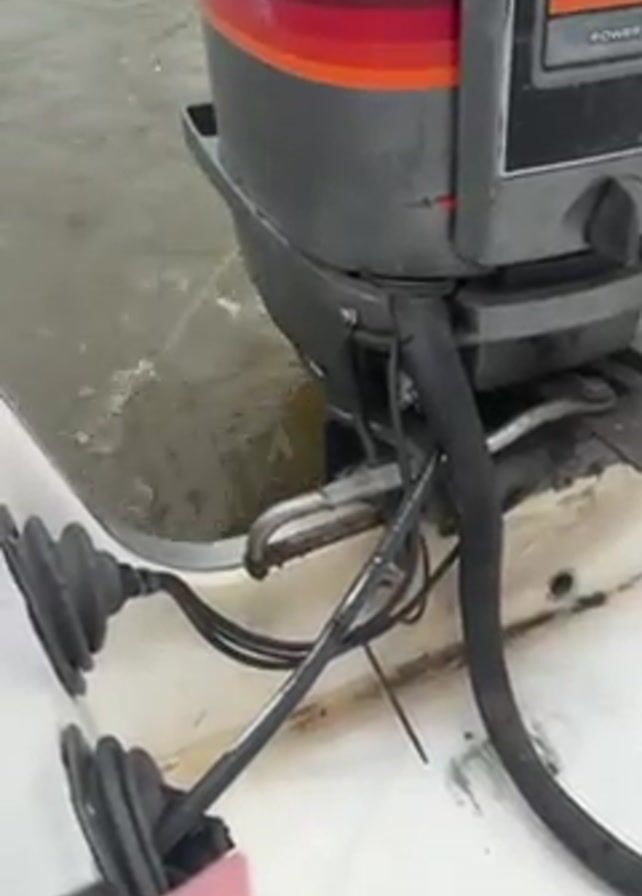 back of a boat and an outboard motor, with the water nearby. The motor is a Mariner, with an aged gray color. The boat is white. Several black cables are visible near the motor and the boat's stern, secured with a zip tie. The water appears slightly choppy and murky. There are no visible people present in the video.