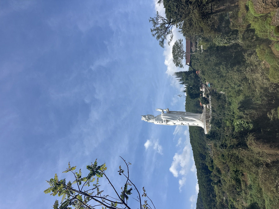 A white statue of a woman stands tall against a backdrop of a bright blue sky with scattered clouds. The statue is set on a green, tree-covered hillside. The landscape includes diverse vegetation, from dense forest to smaller shrubs. In the lower left corner, a tree branch with green leaves extends into the frame. A building can be seen behind some trees.