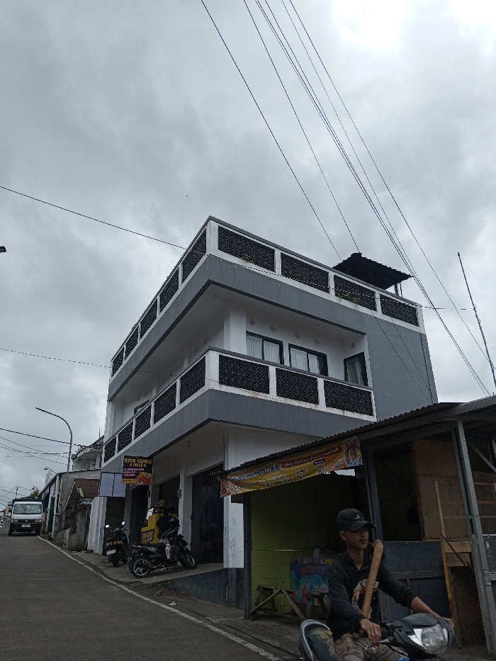 A three-story gray and white building is partially visible in the frame. A man wearing a cap and dark clothing sits on a motorbike on the road. Behind him is a small shop-like structure with a green exterior. Parked motorbikes line the side of the road near the building. Utility wires crisscross the cloudy sky. A white van is seen driving down the road in the distance.