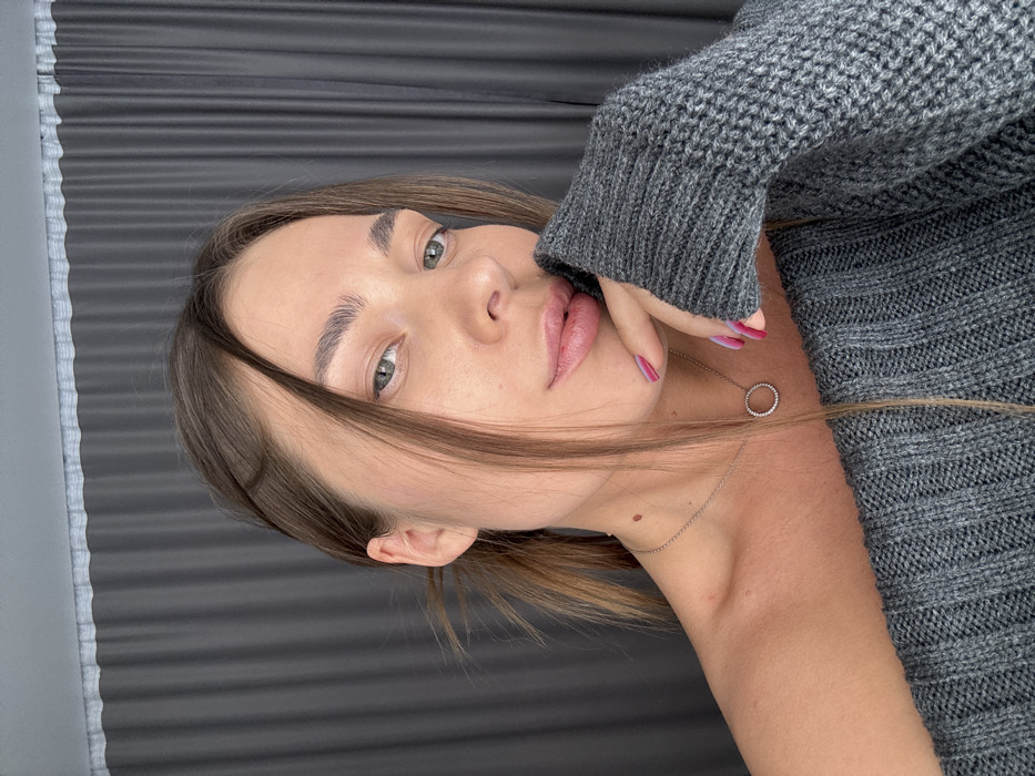 A portrait-oriented photograph depicts an adult female, positioned from the upper torso upwards, looking directly at the camera. The subject has brown hair, styled with some strands falling forward and other portions tied back, revealing her left ear. Her eyes are light-colored, and her lips are a light pink hue. A small, dark mole is visible on the skin of her left clavicle area. She is wearing an off-the-shoulder, knitted sweater in a dark grey color, featuring a ribbed pattern on the main body and a looser knit on the sleeve. A silver-toned necklace with a circular pendant, adorned with small, clear stones, is visible around her neck. Her right hand, with fingers painted fuchsia, is positioned near her chin, partially obscuring the lower right side of her face. The background consists of a uniformly dark grey curtain with vertical pleats, suspended from a light-colored track along the top edge of the frame. The scene is located in the city of Chernushka, Russia.