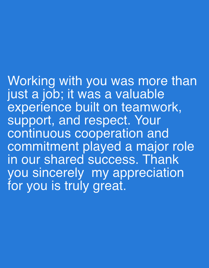 The image displays white text on a solid blue background. The text reads: "Working with you was more than just a job; it was a valuable experience built on teamwork, support, and respect. Your continuous cooperation and commitment played a major role in our shared success. Thank you sincerely my appreciation for you is truly great." No discernible subjects, objects, people, actions, or specific environmental details beyond the text and background color are present. There is no visual information within the image to indicate a physical location in the city of Gaza, Palestinian Territory, or any other geographical area.