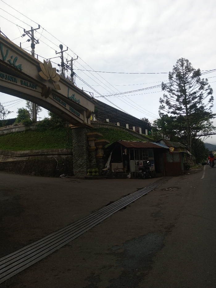 The scene is captured in the city of Sandamal Eliya, Sri Lanka, depicting an overcast daytime view of a roadside intersection. In the foreground, a two-lane asphalt road appears slightly damp, with a metal grate composed of five parallel bars embedded diagonally across it from the lower-left to the mid-right. To the left, a large beige archway with stone-textured pillars spans an upward sloping road. The archway features a central lotus emblem and displays the text 'NGAJAYA BALADY' and 'Vila' on its left section, and 'Lotus' and 'CIANJUR BERSEMI' on its right section. Behind the archway, a steep, grass-covered embankment rises, supported by a stone wall. Utility poles and a dense network of black electrical wires crisscross the cloudy sky above and behind the archway. To the right of the archway's right pillar, two small, rustic structures, constructed primarily from corrugated metal with sloped roofs, stand roadside, resembling vendor stalls. A dark-colored motorcycle is parked in front of the leftmost stall. Further right, a tall, slender coniferous tree dominates the mid-ground against the hazy sky. In the far right background, a person on a red and black motorcycle, wearing a helmet, is observed traveling away from the viewer on the main road. Distant, hazy mountains are faintly visible on the horizon to the right.