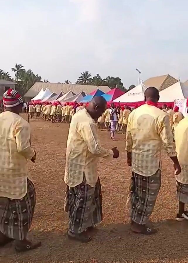 group of men walking in a field, likely participating in a cultural event or gathering. The men are dressed in traditional attire, including light-colored shirts and patterned wraps or skirts around their waists. Some are wearing red caps or head coverings. They are walking in a line, facing away from the camera, towards a gathering of people and rows of tents in the background. The tents are various colors, including white, red, and blue. The field is brown and appears to be dry, with a few patches of grass. There are some buildings and palm trees visible in the distance, adding context to the location. The sky is a pale blue with some clouds, suggesting it is daytime. One of the men is holding a stick. The video is shot from a low angle, giving a sense of being among the group of men.