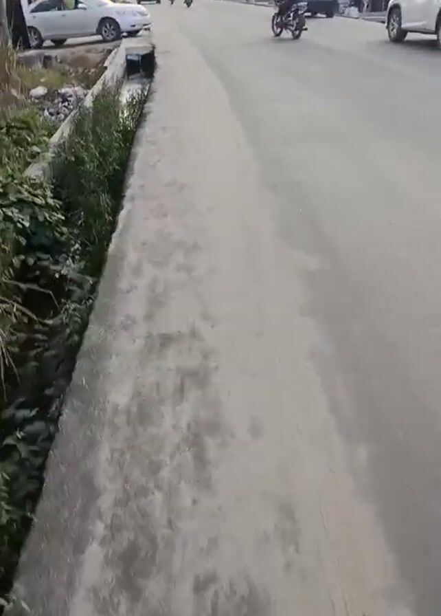 view from a sidewalk alongside a road. The road has several vehicles traveling on it including cars and motorcycles. The sidewalk is concrete and shows some discoloration. Adjacent to the sidewalk is a narrow strip of land with vegetation. The overall environment suggests a suburban or semi-urban area with moderate traffic. The day appears to be overcast or early evening based on the lighting.