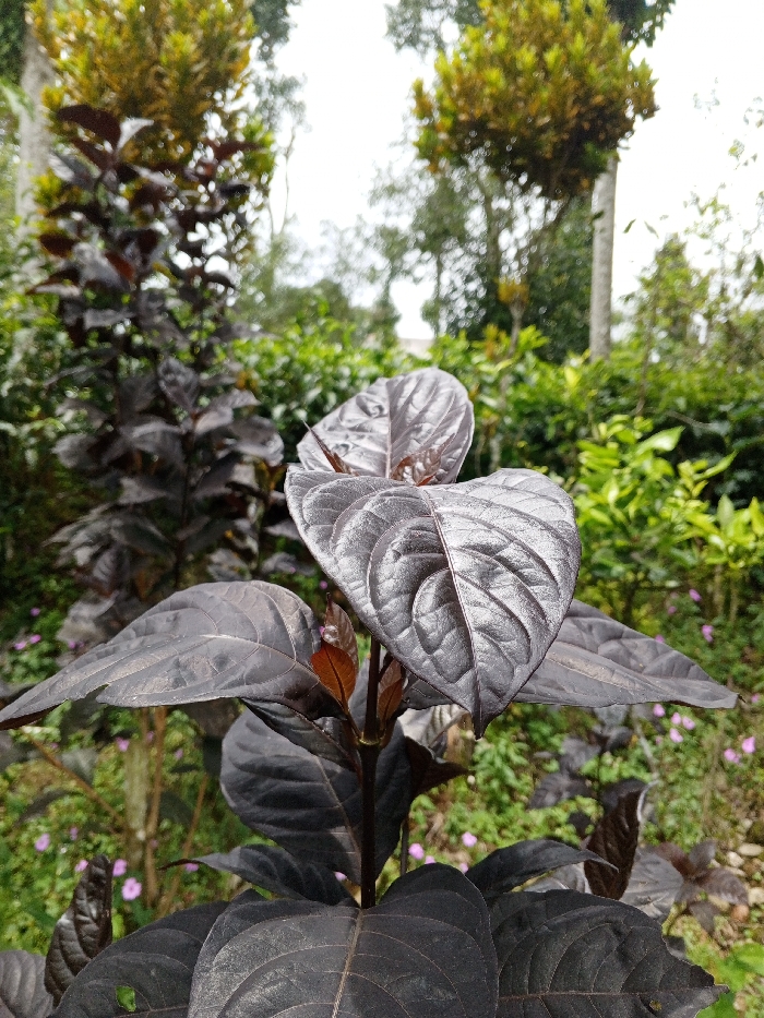 The image displays a close-up, outdoor photograph of a plant, situated in Calbayog, Philippines. The primary subject is a plant with prominent, ovate leaves characterized by a deep purplish-brown to metallic grey-brown coloration, exhibiting a slight sheen and visible venation. The upper leaves are in sharp focus, with younger growth appearing reddish-brown at the plant's apex. The background consists of a heavily blurred natural environment, showing dense green foliage from various trees and shrubs. Small, scattered pinkish-purple flowers are discernible among the ground cover in the mid-background. The upper portion of the background reveals a bright, diffused sky, indicating an outdoor, possibly overcast, setting. No individuals, actions, or specific objects beyond flora are present in the scene.