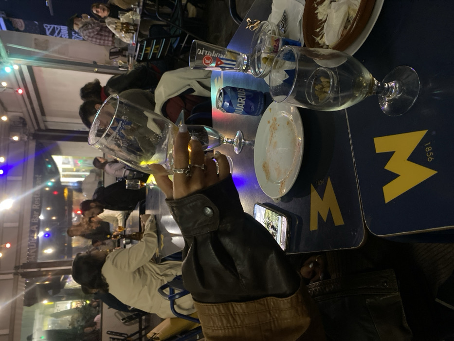 The image depicts a nighttime scene at a bar or restaurant terrace in Barcelona, Spain. The establishment is identified by a visible sign reading "ANDREA Bar Restaurant" in the background. In the foreground, a person's arm, clad in a dark brown leather jacket with a lighter brown shoulder panel, holds an empty or near-empty clear drinking glass by its stem. The hand displays multiple rings and light-colored nail polish. The foreground table is dark blue with a yellow "W" logo and "1856" printed on it. Objects on this table include an empty white plate with food residue, a smartphone displaying a green landscape image, an empty blue "Aquarius" branded soda can, a tall clear glass with a red logo, a small cup containing green olives nestled within another clear glass, and a rustic brown ceramic dish containing white remnants. The midground features several patrons seated at similar dark blue tables with blue chairs. They appear to be socializing. One individual in a light-colored jacket is prominently visible facing away from the camera. Other figures are partially obscured. The background shows the restaurant's interior lighting and string lights with colored bulbs (red, yellow, blue, green) strung across the ceiling or awning of the patio area. Transparent panels appear to enclose the seating space. The overall scene suggests a casual, post-meal or drinks gathering.