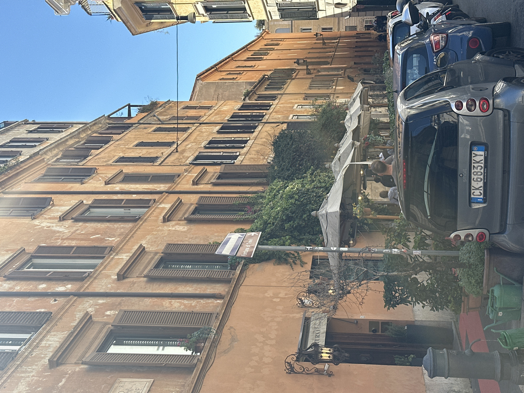 The image depicts a narrow street in Rome, Italy, specifically identified by a street sign indicating the direction to "Fontana di Trevi