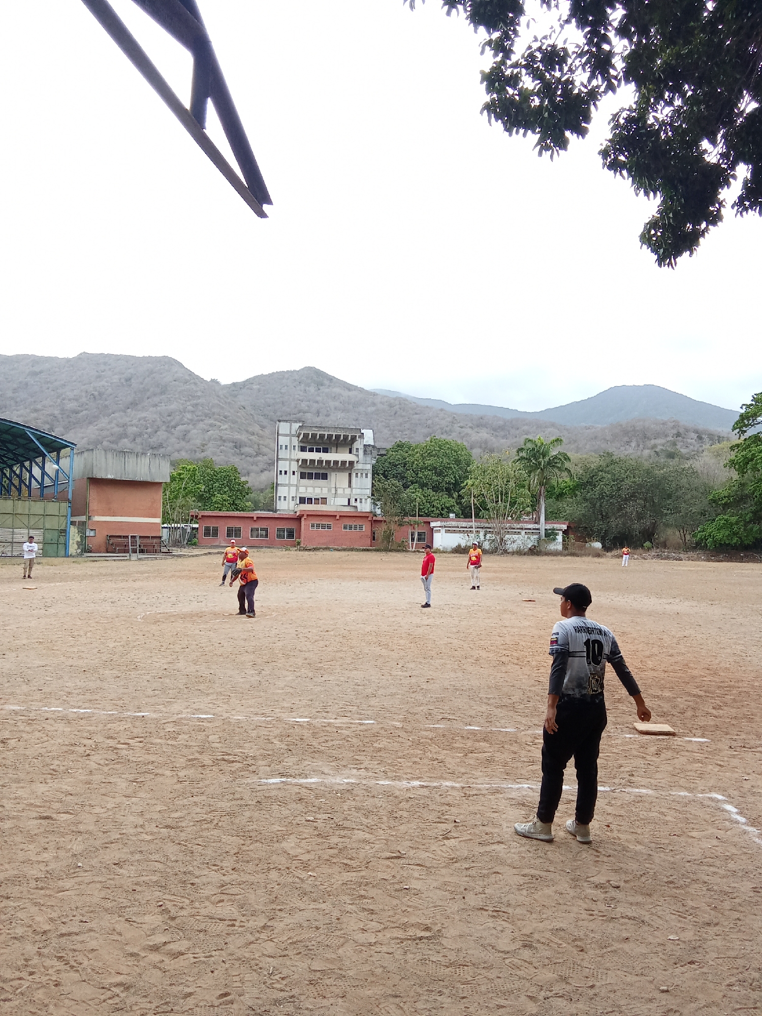 baseball field in Las Barrancas, Venezuela. Several people are playing or standing on the field. In the foreground, a batter wearing a "HARDFIGHTER 10" jersey stands near home plate with a bat. Other players are positioned on the field in various locations. Buildings and mountains can be seen in the background. The field is dirt with white lines marking the base paths.