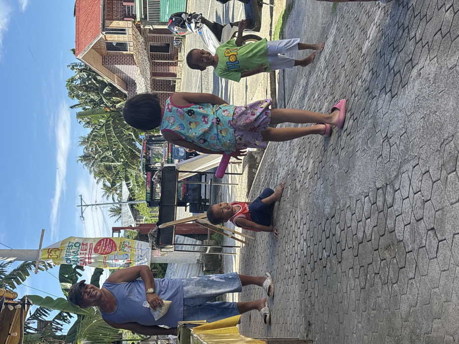 The image depicts an outdoor daytime scene in Burgos, Philippines, under a clear blue sky. Four individuals are present on a grey hexagonal-patterned pavement. On the far left, an adult male, wearing a blue tank top, faded denim shorts, and a dark baseball cap, stands smiling towards the camera, holding a clear plastic bag. A gold-toned watch is visible on his left wrist. Behind him, a tall pole displays a white banner with red text, including "OMNIFEST PANALO SALE." In the center-left foreground, a young barefoot child in a red sleeveless top and dark blue pants is seated on the pavement, smiling. To their right, a slightly older child, wearing a light blue sleeveless top with cartoon prints and a light purple patterned skirt, stands with their back largely to the camera, holding a pink object in their left hand. Further to the right, a third barefoot child, dressed in a green t-shirt with "HOP!" and a yellow smiley face, and white shorts, stands smiling towards the center. In the mid-ground, a black metal barbecue grill is situated behind the seated child. Beyond the pavement, a paved road is visible. Parked on or beside the road are a dark-colored tricycle, which has "BIBLE BAPTIST CHURCH FAMILY" text partially visible on its roof, and a white scooter or motorcycle. The background features a two-story building with reddish-brown brick-like siding and a prominent red corrugated metal roof, alongside lush tropical vegetation including palm trees.