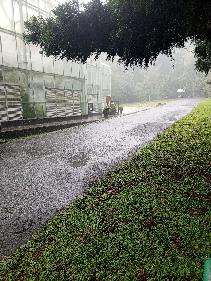 A rain-soaked paved road stretches between a glass-walled building and a grassy verge. The building has a series of louvered windows. A large tree branch overhangs the scene. A blurry, distant structure appears further down the road. Raindrops are visible on the road, and the foliage is lush and green. The lighting suggests overcast conditions.