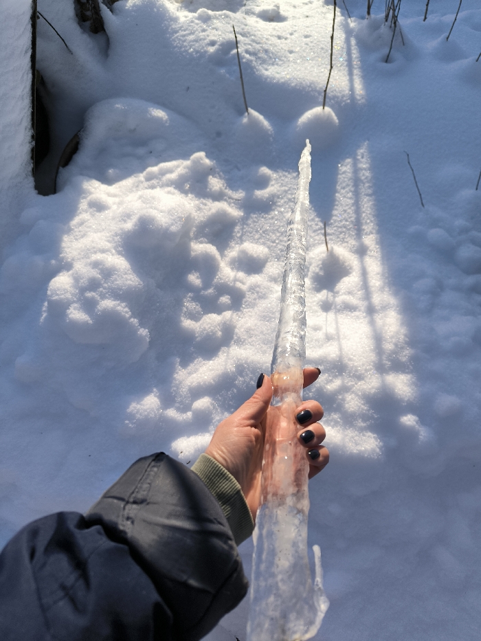 The image displays a close-up, high-angle perspective of a human hand holding a large, elongated icicle in a snow-covered outdoor environment in Parkhomivka, Ukraine