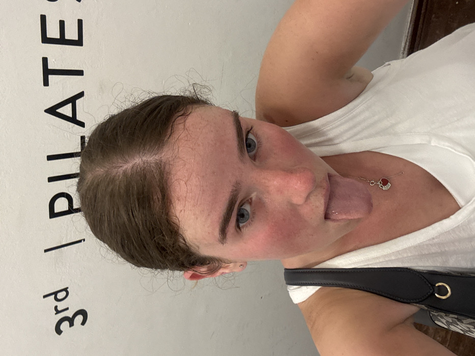 A young woman with brown hair, blue eyes, and a flushed face is captured in a head-and-shoulders selfie, sticking her tongue out towards the camera