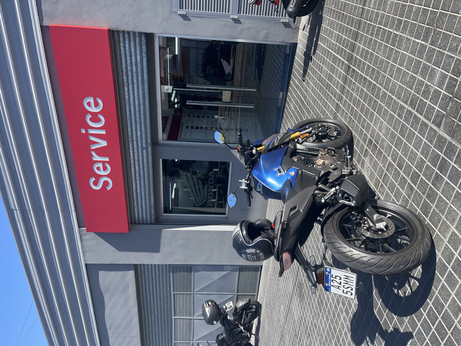 The scene depicts the exterior of a motorcycle service center in Sarandí, Argentina, under bright daylight. A blue and black Honda motorcycle, identified by a partially visible Argentine license plate "A25 53MM," is parked on a kickstand on a paved surface of dark gray square pavers, facing the building's main entrance. A black open-face helmet with a white "40" decal rests on its rear seat. To the left, a second black motorcycle with a top case is parked. The building has a gray facade with corrugated metal accents. Above the central glass double-door entrance and adjacent windows, a prominent red sign with white lettering reads "Service." The windows reflect ambient light and interior "HONDA" branding, along with the reflection of a dark vehicle, possibly a Honda van. Two large, corrugated gray metal rolling doors are present on either side of the central entrance, with the left one fully closed. No individuals are visible in the image.