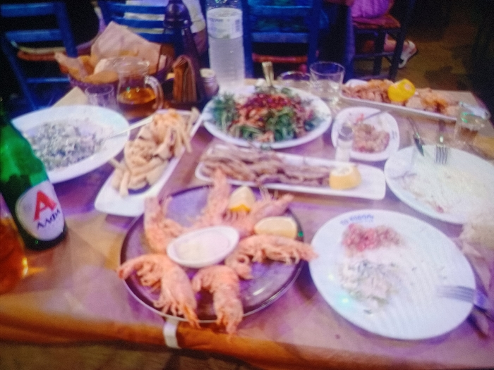 This image depicts a generously laden dining table within a dimly lit restaurant or taverna, indicative of a meal in Athens, Greece