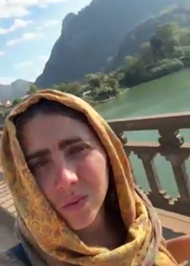 A woman wearing a yellow paisley headscarf stands on a bridge with ornate concrete railings. She looks directly at the camera, puckering her lips slightly. Behind her, a wide river reflects the bright sky, and a green hillside rises in the background. Houses are visible on the riverbank. The day is sunny and bright.