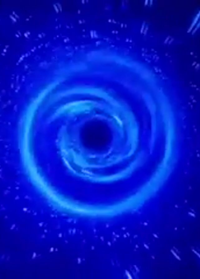 swirling, abstract vortex of light and color. It begins with a predominantly blue hue and gradually transitions towards a turquoise or teal color as the video progresses. The vortex is surrounded by a dark background with small, bright, and rapidly moving streaks of light. These streaks are mostly blue and red, adding to the dynamic feel of the image. The vortex itself has a dark center, suggesting a tunnel-like effect or a deep hole.