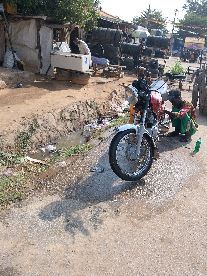 This image depicts a roadside scene in Kagini, Nigeria. On the right, a dark-skinned male, dressed in a multi-colored long-sleeved shirt and green trousers, squats on a paved road beside a red and silver motorcycle, appearing to perform maintenance. A green plastic bottle lies on the pavement near him. The motorcycle is positioned with its front wheel angled slightly left. To the left of the motorcycle, a drainage ditch runs parallel to the road, containing stagnant water and various items of litter, including plastic bags and bottles. Beyond the ditch, a dirt path leads to a series of makeshift structures. A light-skinned male, wearing a light-colored long-sleeved garment, stands behind a white chest freezer. The freezer is elevated on two stacked tires and a wooden frame, situated next to a stall constructed from wood and white tarpaulin. Further into the background, a tire shop is visible, featuring numerous black tires stacked on metal racks. A wooden cart with large wheels is partially visible on the far right. In the distance, a yellow commercial signboard and other blurred figures suggest further urban activity. Overhead wires and scattered trees are also present. The scene is illuminated by daylight, casting shadows from the motorcycle and nearby objects onto the paved surface.