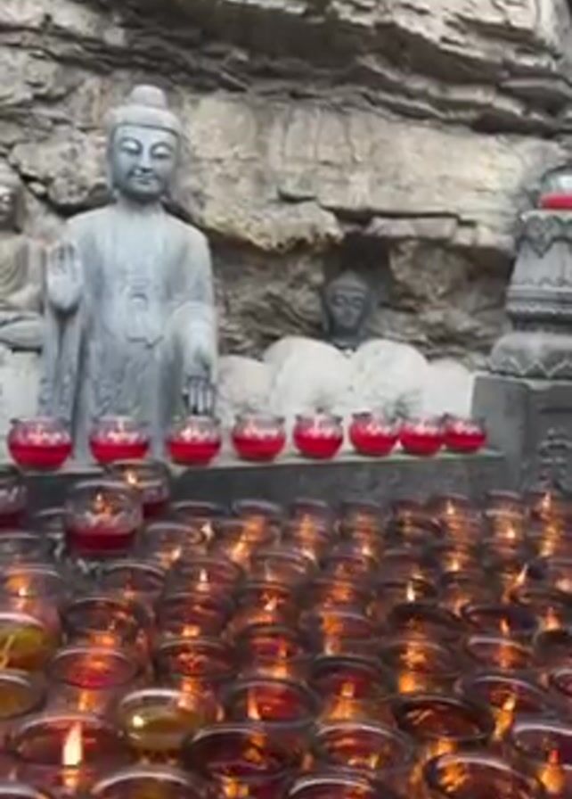 The camera is positioned at eye level and focuses on a collection of lit candles arranged in a grid. The candles are in clear glass containers with red wax. Behind the candles are three carved statues of Buddha set against a rocky, grey wall. The statue on the left is standing with its right hand raised. The statue in the center is reclining. The statue on the right is partially obscured by a stone pillar. The video is well lit and the flames of the candles are clearly visible. The scene appears to be part of a Buddhist temple or shrine. Sounds of people talking and music are present in the audio.