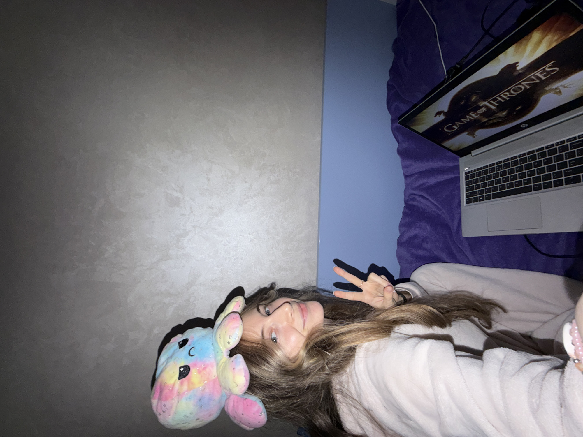 A person is lying on a purple-colored bed, likely in a residential setting. An HP laptop is positioned above them, displaying the title card of "Game of Thrones." To the left of the person is a multi-colored stuffed unicorn. The person is making a peace sign with their right hand. The background is a light gray wall, adjoined by a blue wall where the bed is positioned. There is nothing in the image to indicate the location is in Plovdiv, Bulgaria.