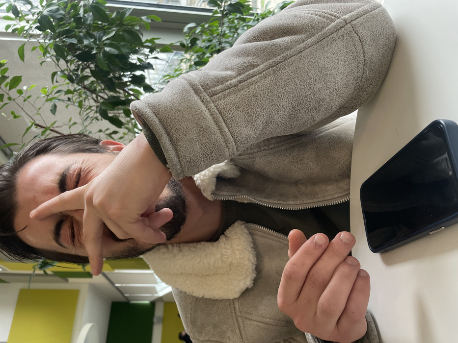 An indoor, well-lit scene depicts a male individual seated at a white table, partially obscured by his left hand. The man has dark hair and a beard, wearing a light grey or beige jacket with a white shearling collar and a visible dark green undergarment. His left hand is raised, with fingers spread to form an "X" or star shape over his eyes and the bridge of his nose, obscuring them. Creases around his eyes and a partially visible mouth suggest an expression of amusement or laughter. His right hand rests on the white table. A dark blue smartphone with a black screen lies face-up on the table in the foreground. The background features distinct wall panels in lime green and a darker green/teal to the left. To the right, a large, leafy green plant is positioned in front of a window, revealing an indistinct outdoor view bathed in daylight. A faint figure is visible in the far left background. This location is a modern interior space, likely a common area, cafeteria, or lounge within an educational or corporate building in the city of Roubaix, France.