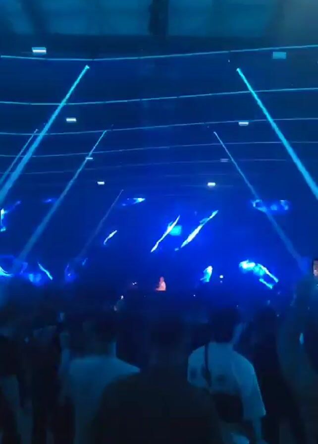 The video depicts a live concert. An audience is visible in the foreground, facing a stage in the distance where a performer appears as a silhouette. The scene is illuminated by intense blue lights emanating from above and behind the stage. The venue seems to be an indoor arena or large hall with a high ceiling. The audience is comprised of numerous people. The overall atmosphere appears to be energetic and dynamic.