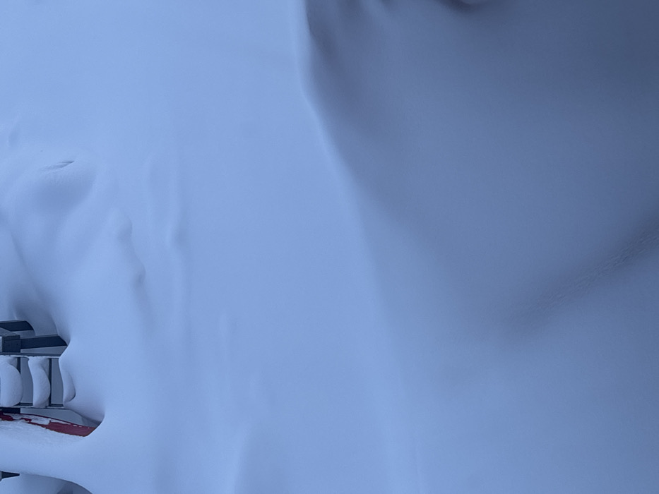 A close-up, rotated view shows a landscape dominated by fresh, deep snow. The surface is uneven, with drifts and subtle undulations. A partially buried metal railing and a hint of a red object peek through the snow in the lower left corner, indicating a structure or object underneath the heavy accumulation. The image is monochromatic, in shades of white and pale blue.