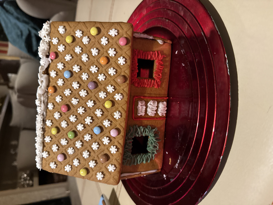 A gingerbread house sits on a shiny, red, tiered plate. The side facing the viewer is decorated with white snowflake-shaped icing and colorful candy dots arranged in a grid pattern. White icing lines the edge of the roof. The front of the house features a red-trimmed window, a white icing design, and a green-trimmed entrance. The house appears to be constructed from a light-brown gingerbread material. The background shows a blurred view of furniture and décor.