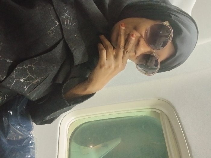 The image depicts an individual seated inside an airplane cabin. The person, an adult female, is viewed from the chest up, wearing a dark headscarf and large, round, light-framed sunglasses with dark tinted lenses. A small nose piercing is visible. Her right hand, with red nail polish, is positioned with fingers near her mouth. She is wearing a dark garment, possibly an abaya or jacket, adorned with a silvery, web-like or cracked pattern. To her right, an airplane window reveals a predominantly dark, greenish-tinted exterior view, with a faint outline of an aircraft wing or engine visible in the lower right portion of the window. The interior cabin walls and ceiling are light-colored. A part of an airplane seat, covered in clear plastic, is visible in the lower right foreground. The specific location of the aircraft within Madinah, Saudi Arabia, is not discernible from the visual content of the image.