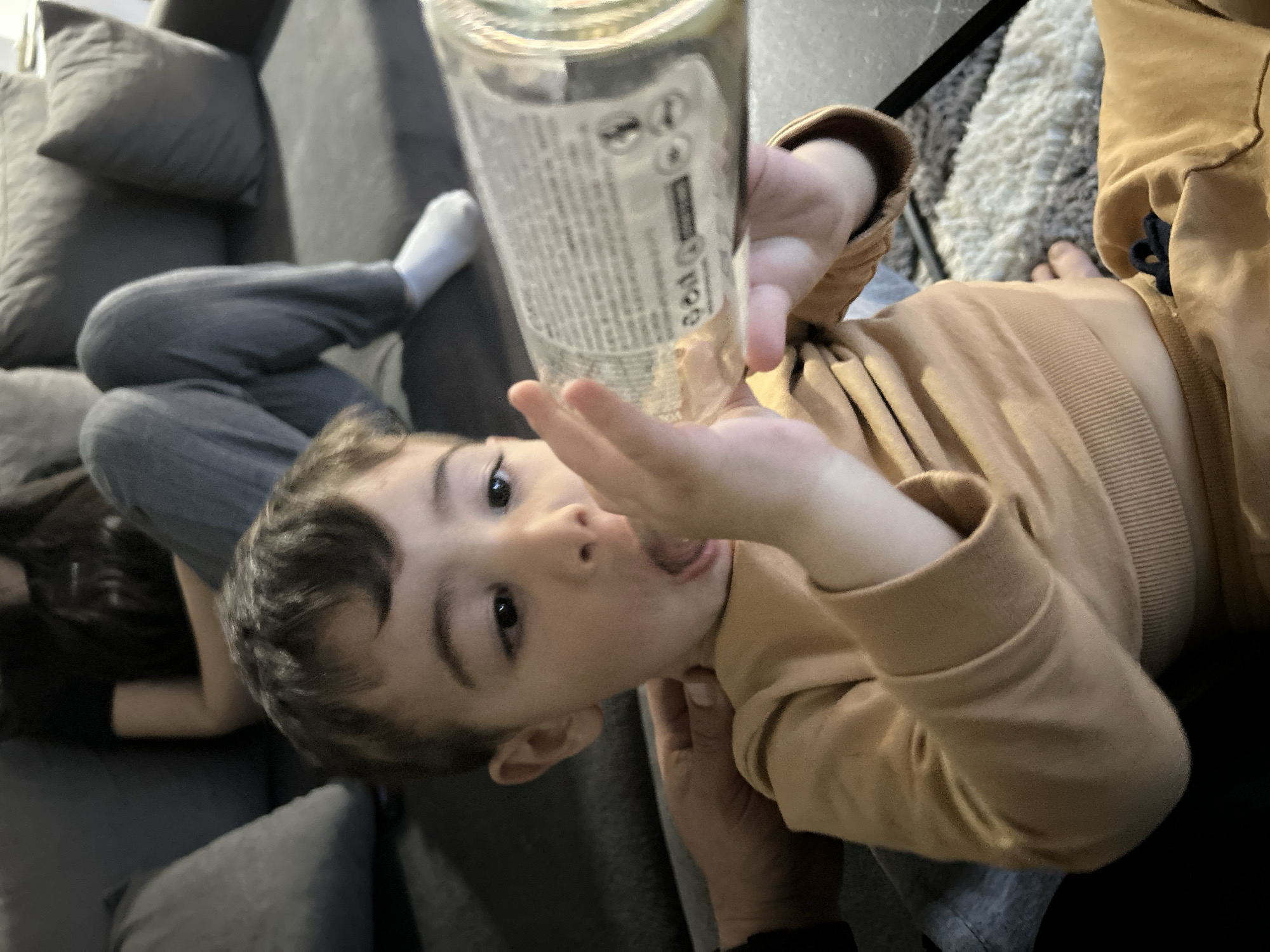 A child is drinking from a glass bottle while sitting on a grey couch. The child wears a tan-colored long-sleeved shirt and grey pants. A person wearing grey pants and white socks sits adjacent on the couch. Pillows are on the couch, and a person's arm rests nearby. The scene's location is unknown and could not be placed in Kardzhali, Bulgaria.