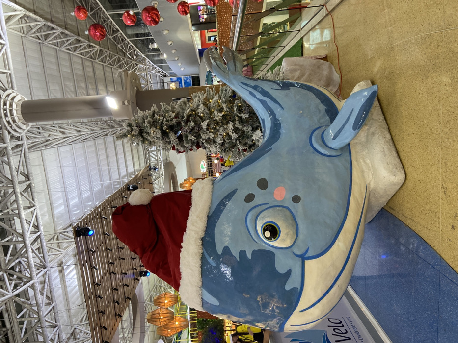 An indoor space features a large, cartoonish whale sculpture wearing a Santa hat