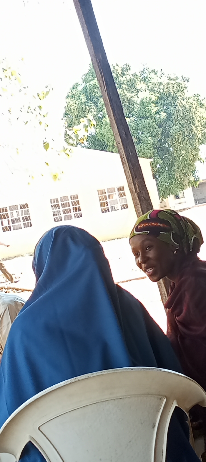 The image depicts an outdoor scene in Kinkinau, Nigeria, under bright daylight. In the foreground, the back of an individual wearing a royal blue hijab or head covering is visible, seated in a white, possibly plastic, chair. To the right of this individual, another person with dark skin is captured from the chest up, facing partially left with a clear smile, revealing teeth. This second individual wears a multi-patterned headwrap with green, pink, and dark tones, along with a maroon-colored garment. Small hoop earrings are visible on their ears. A large, dark wooden pole extends vertically through the midground, slightly off-center. Behind the individuals, a light-colored building with multiple rectangular windows divided into smaller square panes is prominent. Green foliage from trees is present both in front of and behind the building, with a bright sky overhead. The ground appears to be dry, exposed earth.
