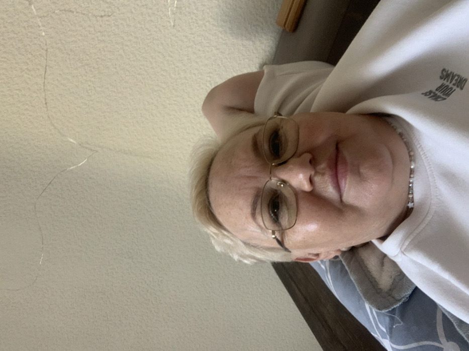 A close-up, slightly upward-angled photograph depicts an adult female reclining indoors. The subject is a middle-aged woman with fair skin, short light-colored hair, and gold-framed glasses. She wears a white long-sleeved top, possibly a sweatshirt, with the phrase "CHASE YOUR DREAMS" printed on the lower right chest/shoulder area, and a multi-bead necklace around her neck. She is positioned on a light blue and white patterned pillow, partially covered by a grey fabric. Her right arm is bent and raised, with the hand obscured behind her head. Her gaze is directed towards the camera, and her expression is neutral to slightly smiling. The background consists of a textured, light-colored (beige/off-white) wall. Thin, silvery string lights are sparsely draped across the upper portion of the wall. To the right of the subject's head, a dark brown furniture surface is partially visible, upon which a small wooden object, possibly a phone stand, rests. The setting appears to be a private interior space, likely a residence. The specific location within the city of Chaikovsky, Russia, cannot be determined from the visual information provided in the image.