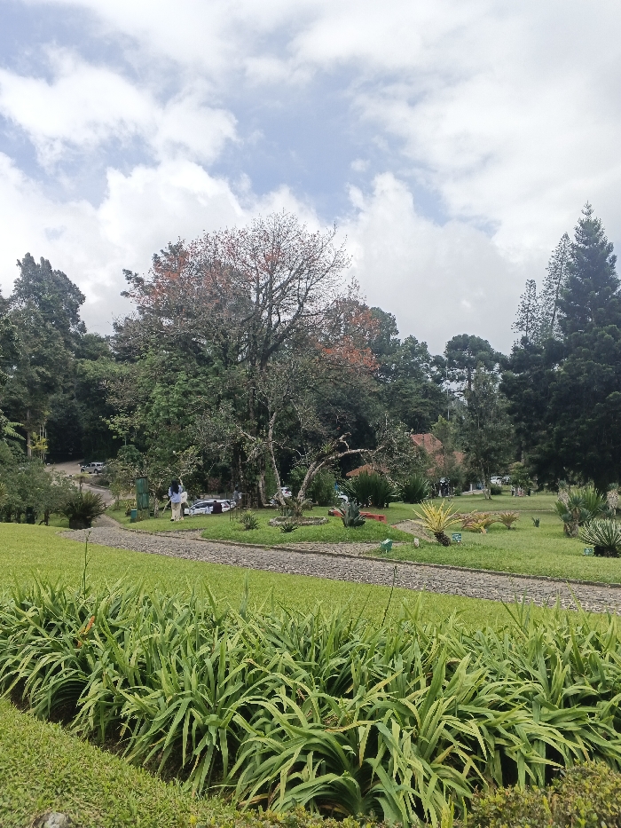This image displays a landscaped park or garden environment within the city of Bagochen Boolingpang Ueling, Bhutan, under an overcast sky featuring scattered white clouds. The foreground is dominated by rows of vibrant green, strap-leaved plants, with a trimmed green hedge bordering the lower left. A curving, stone-paved path extends through the midground, flanked by manicured green lawns. One individual, wearing light-colored attire, is observed walking away from the camera on this path towards the left. Several vehicles, including a white SUV, are visible parked or moving on a higher section of road and among trees in the background to the left of the path. A large tree with a distinctive gnarled trunk and reddish-orange foliage stands prominently in the center-left midground. The background consists of dense mixed forestation, with a building featuring a reddish-brown roof partially discernible amidst the trees in the center-right. Ornamental shrubs and smaller plants are arranged in beds throughout the grassy areas.
