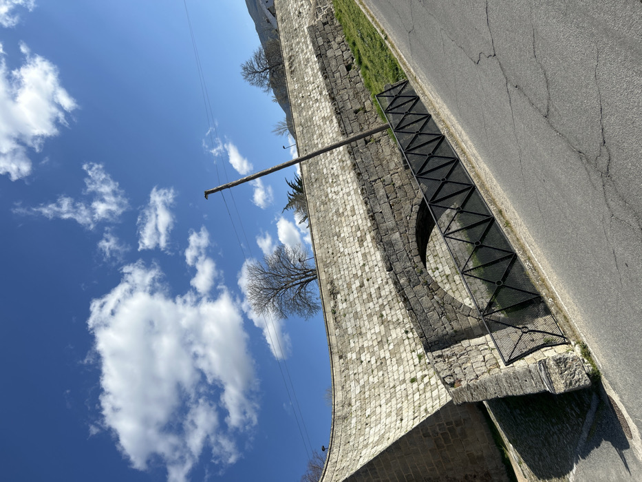 The scene, located in Piedrahíta, Spain, presents an exterior view of a sloped paved road adjacent to historical stone architecture under a clear blue sky with scattered white cumulus clouds. The dominant feature is a substantial, curved retaining wall or viaduct constructed from light-colored, rectangular cut stones, ascending from the lower-left towards the upper-right. Beneath this large wall, a darker, rough-hewn stone structure is visible, featuring a distinct archway that passes underneath. A black metal fence, characterized by a repetitive triangular mesh pattern, runs along the edge of the asphalt road, partially obscuring the lower stone structure and archway. The asphalt road, displaying visible surface cracks, slopes upwards from the bottom-right corner of the frame. A tall, slender wooden utility pole with a single visible overhead wire stands upright between the road and the stone structures. Patches of green grass are visible between the road and the stone masonry. Bare deciduous trees are situated atop the stone wall and in the background, indicative of a dormant season, alongside some evergreen foliage. No individuals or vehicles are present in the scene.