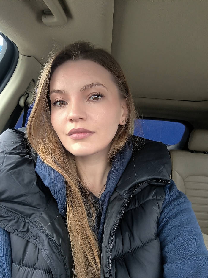 The image displays a female individual situated within the passenger compartment of a vehicle. The specific location within Vinnytsia, Ukraine, is not identifiable. The subject possesses light skin, long straight brown hair, brown eyes, and light-colored eyebrows, with a small circular stud earring in her right earlobe. She wears a dark blue hooded sweatshirt beneath a black puffer vest, secured by a zipper. A metallic chain is visible around her neck. She maintains direct eye contact with the camera, exhibiting a neutral facial expression. The vehicle's interior includes a beige headliner and a tan-colored passenger seat visible in the background. A large blue area is discernible through the rear window, suggesting an outdoor setting under natural light.