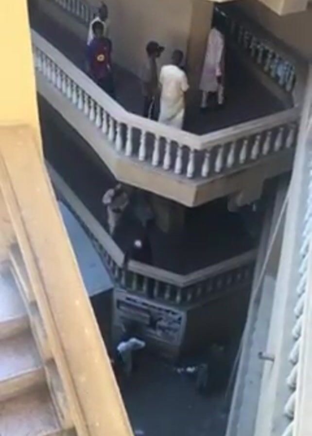 n atrium with multiple levels, each with a walkway and a balustrade. Several people are walking on different levels of the atrium. Most of the people are wearing casual clothing, while some are wearing traditional attire. The atrium has a neutral color scheme with light-colored walls and balustrades. There is a sign visible on the ground level. The camera is positioned on an upper level, looking down into the atrium. The lighting is bright and appears to be natural.
