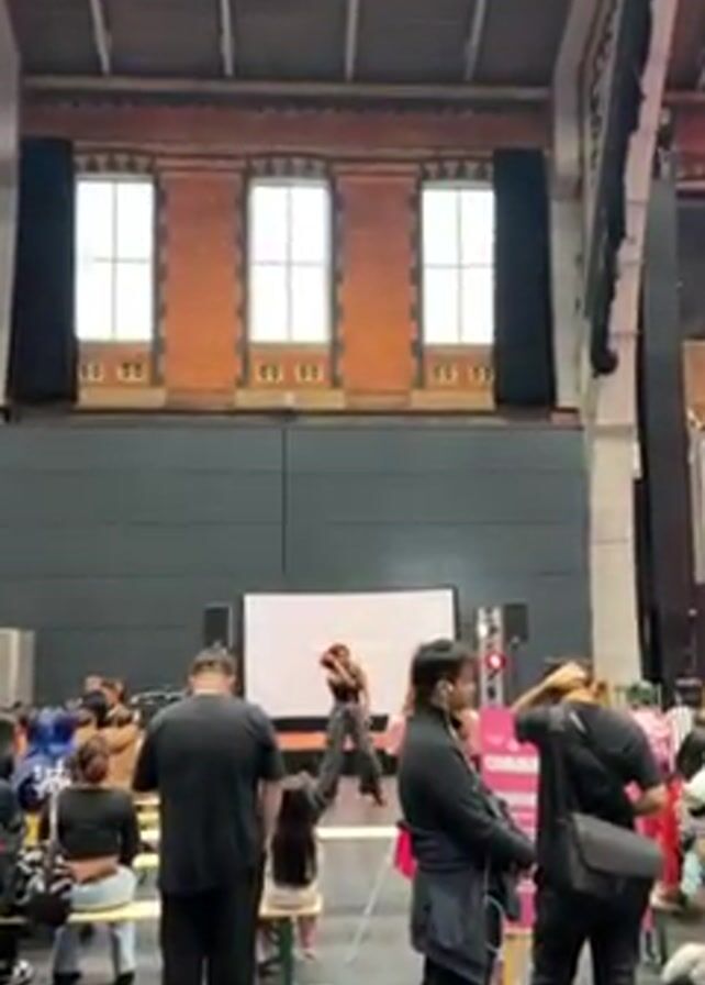 A woman in a black top and gray jeans is dancing on a stage in a large room. A screen behind her says "HYUNA, SATURDAY." The stage is flanked by speakers and lights. In front of the stage, a group of people is seated on benches and standing. A few people are taking pictures with their phones. The room has a high ceiling and brick walls with windows. The atmosphere is lively.